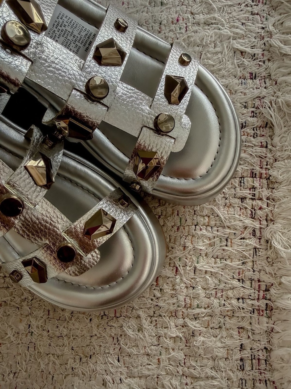 Cuenta con apliques de diferentes formas (tachas y remaches).